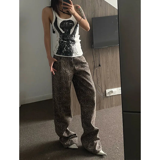 High Waist Leopard Print Fashion Streetwear Harajuku Vintage Brown Jean