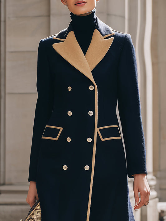 Navy Blue Double - Breasted Coat With Camel Contrast Details