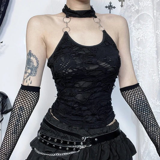 Dark Punk Sexy Bodycon Out Gothic Techwear Lace Crop Mall Grunge Cut Splice Top
