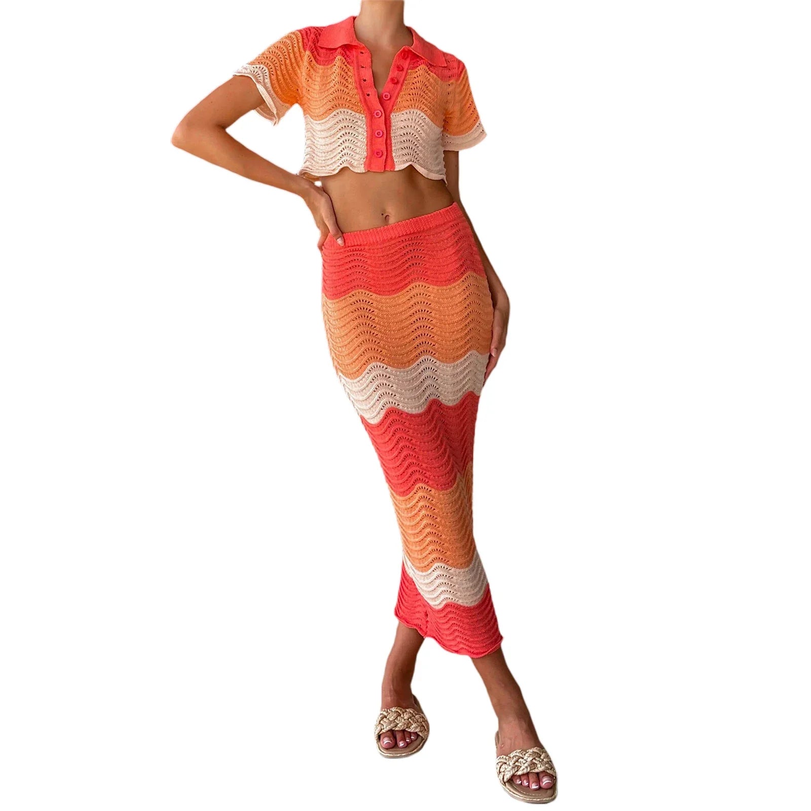 Womens Two Piece Summer Outfits, Short Sleeve Knit Button Crop Tops and Long Skirt Set