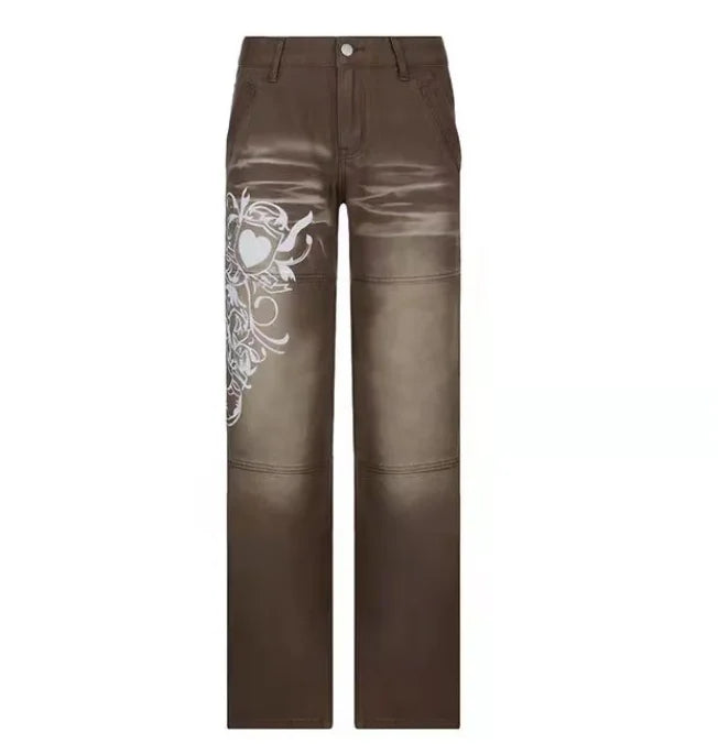 Printed Cargo High Waist 90s Baggy Dark Blue Brown Jean